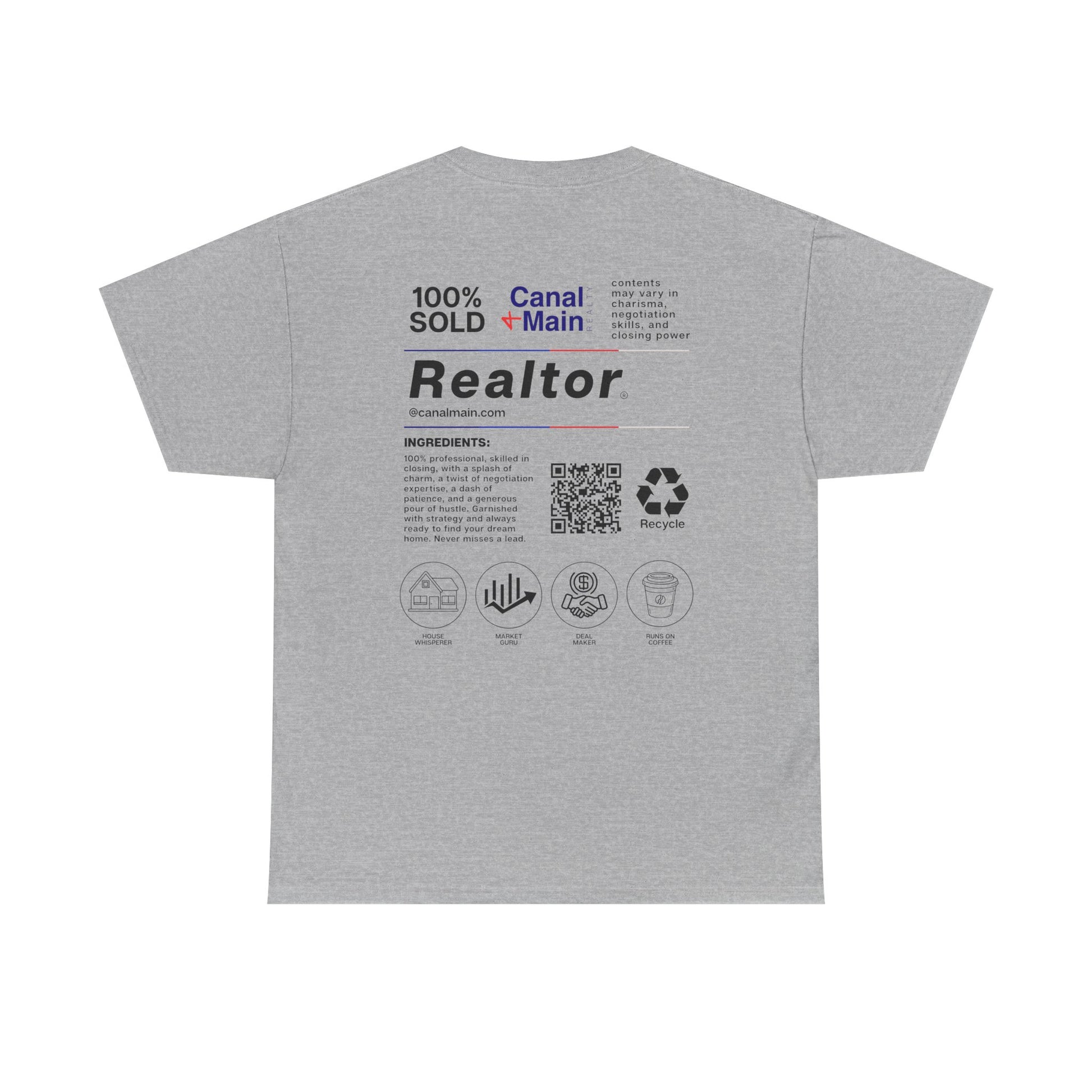 A clean, thoughtfully designed realtor tee that reads like a professional badge and a subtle inside joke for real estate pros. On the front, a small Canal + Main logo sits over the heart—understated and confident. The back turns practical metrics and icons into graphic art: “100% SOLD,” a bold Realtor label, ingredient-style copy, a scannable QR block and minimalist icons that hint at listings, market data and sustainability. Lightweight but sturdy cotton keeps the print crisp and wearable through busy open-houses, client walks and weekend meetups. It’s the kind of shirt a real estate agent reaches for when they want to look put-together without trying too hard, and to spark a smile from colleagues who get the references.
